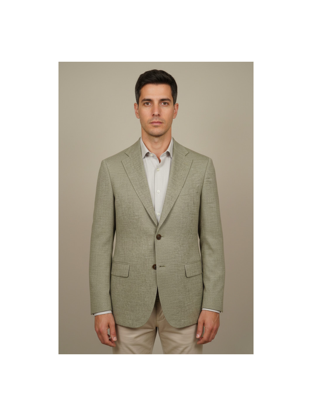 Americana en tono verde. Tejido hiperelástico con un micro dibujo al tono. Cierre de dos botones y con dos aberturas en la espalda.