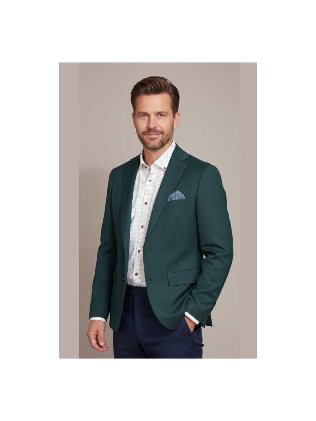 Americana de corte Slim Fit en color verde. Con medio forro interior. Bolsillo en el pecho con forro interior efecto pañuelo. Cierre de dos botones y con dos aberturas en la espalda.