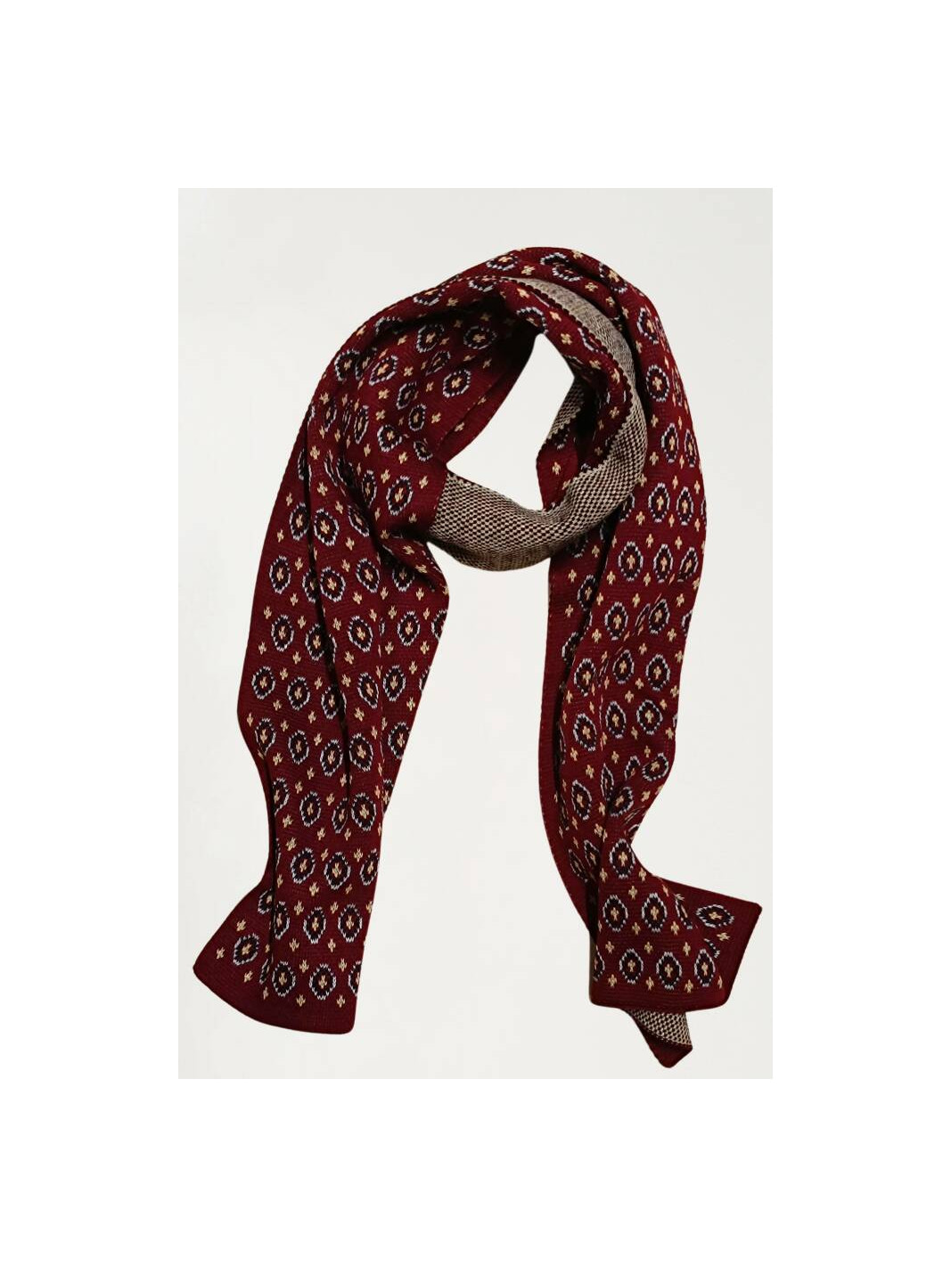 Bufanda de punto en tejido acrílico. En color granate con dibujo. Reversible en color tostado. Fabricada en España.