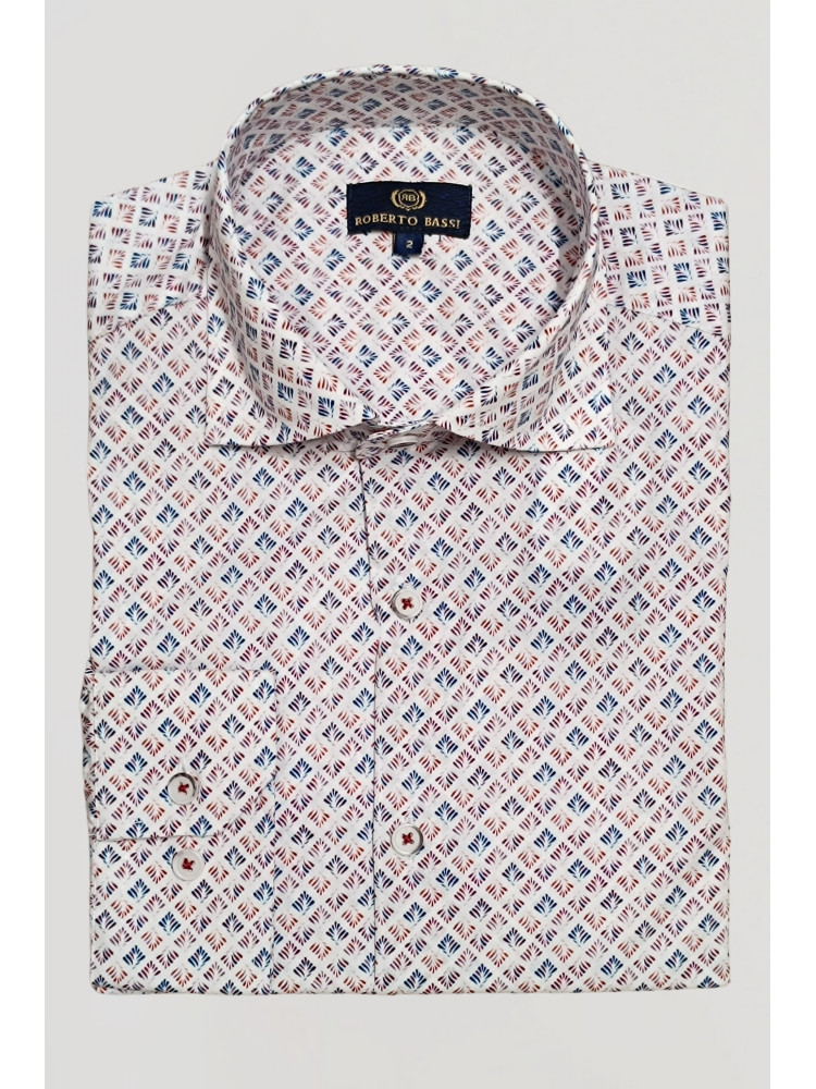 Camisa manga larga de hombre. Corte Slim Fit con pinzas en la espalda. Estampado en tonos granates y azules. Composición: 97% Algodón 3% Elastano