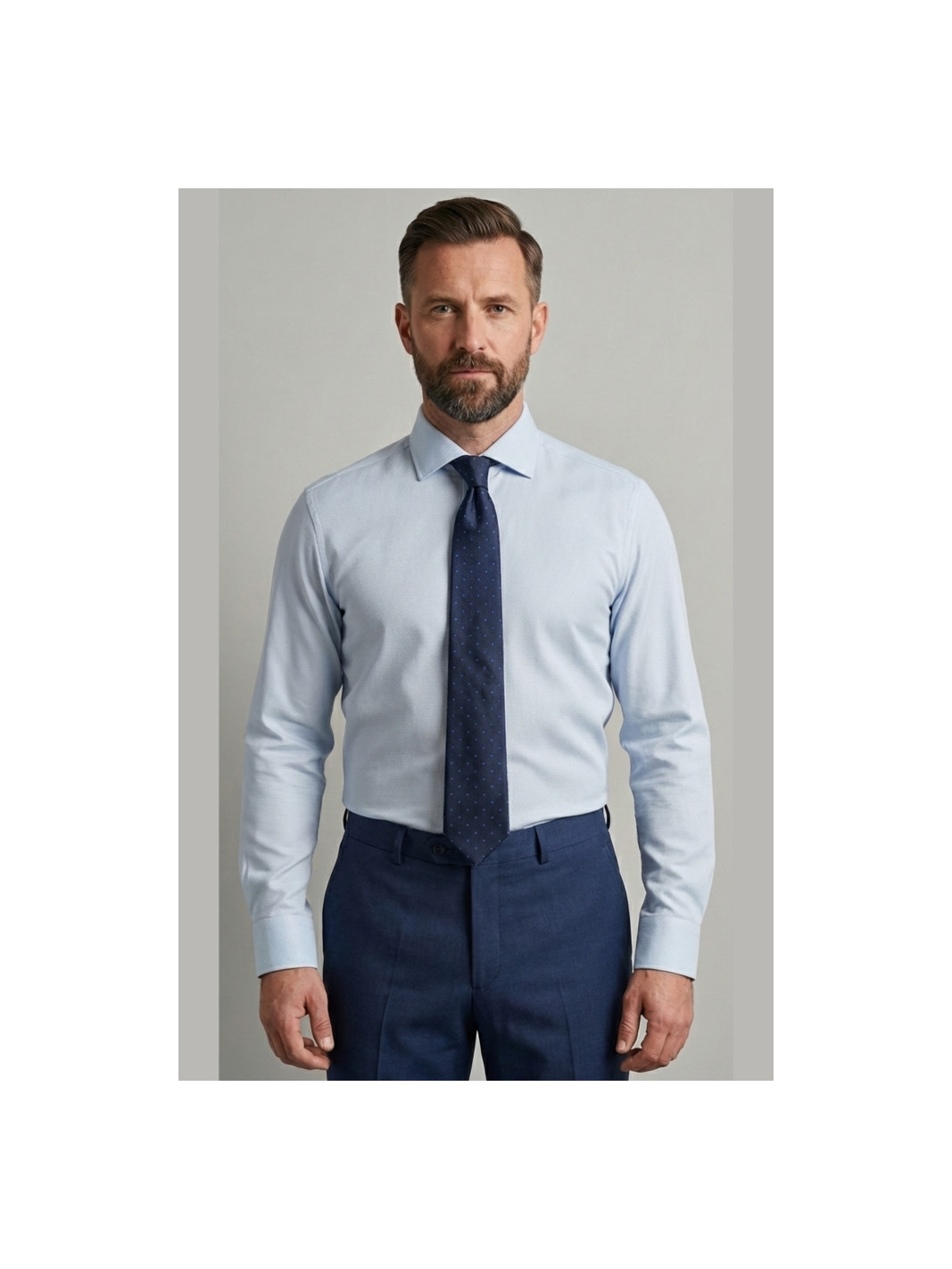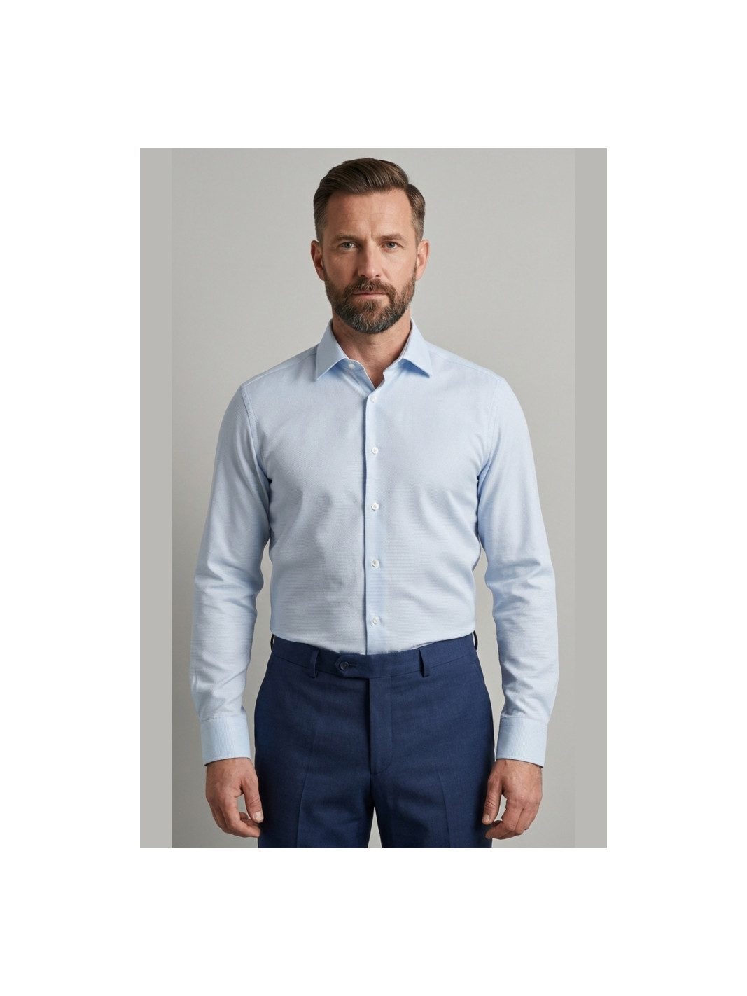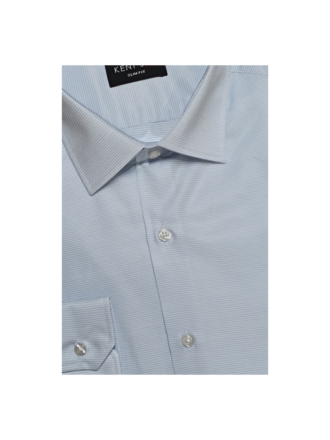 Camisa falso liso en color azul celeste muy claro. Corte semientallado y tejido de fácil plancha. Composición: 50%Algodón 50%Poliester