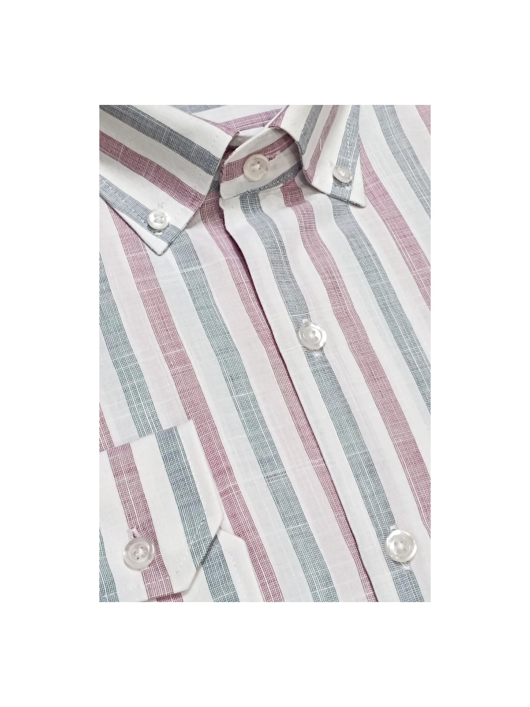 Camisa con bolsillo en el pecho. Fondo blanco con rayas en color azul y granate. Corte Regular Fit. Composición: 70% Algodón 30% Poliéster