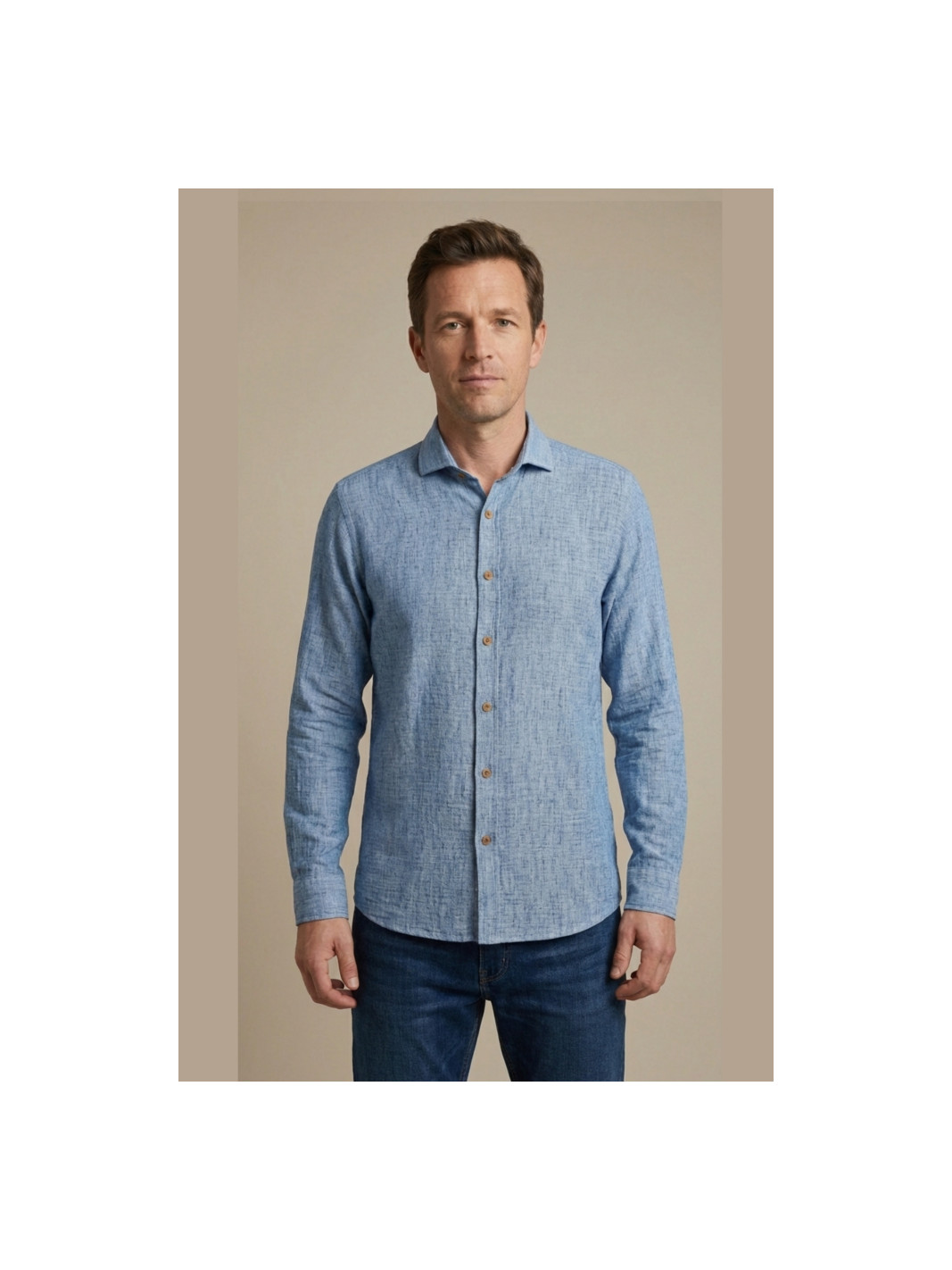 Camisa azul denim con cuello sin botón. En color blanco con botones imitación madera. Corte Regular Fit. Fabricada en España El tejido tiene la textura de una mezcla de lino y algodón, pero no arruga. Tipo bambula. Composición: 100% Poliéster transpirable