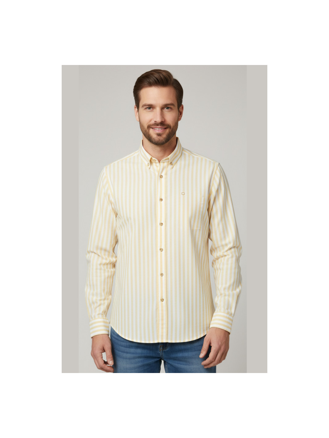 Camisa manga larga, confeccionada en un suave y ligero tejido 100% algodón. Fondo claro con rayas en color amarillo. Corte Regular Fit.