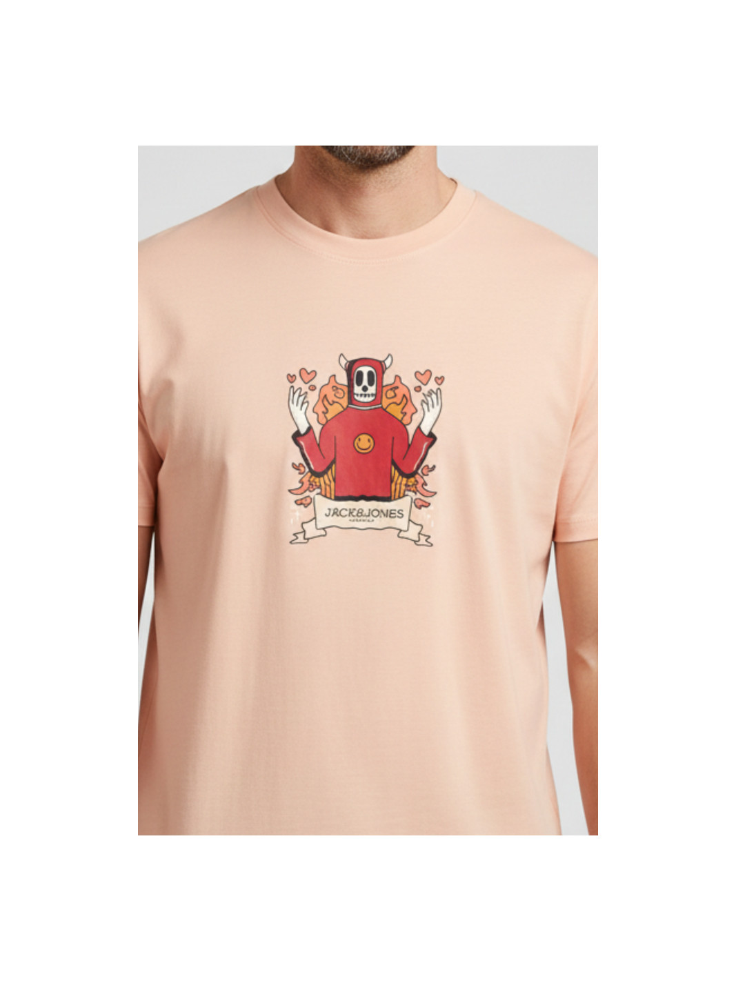 Camiseta de color melocotón con estampado de diablo meditando. Fabricada en tejido 100% algodón orgánico. Corte Regular Fit