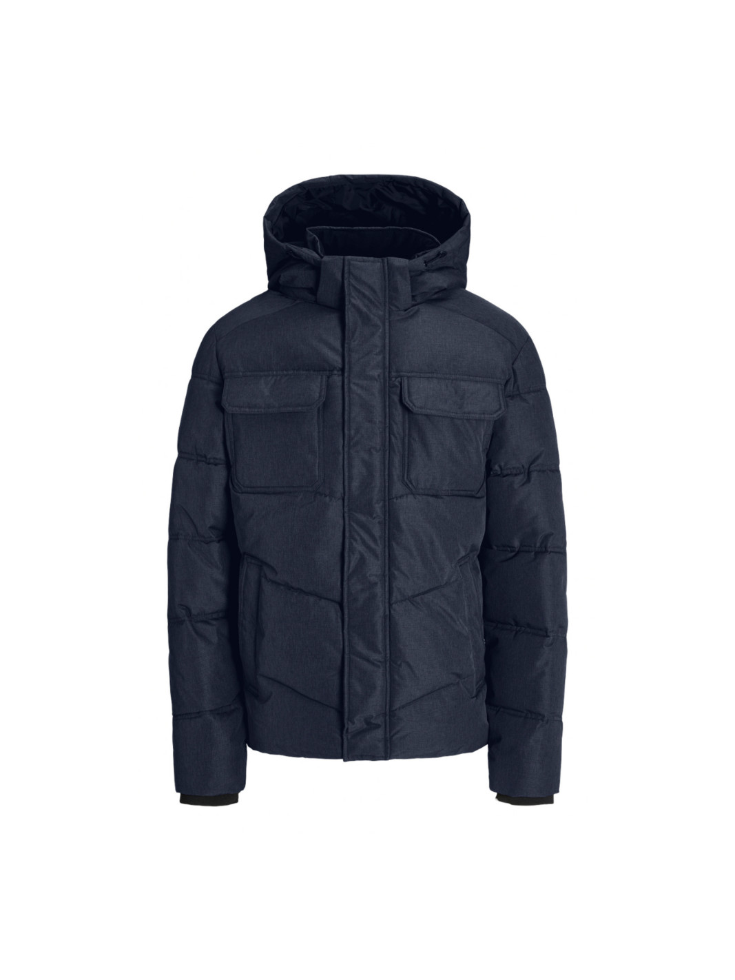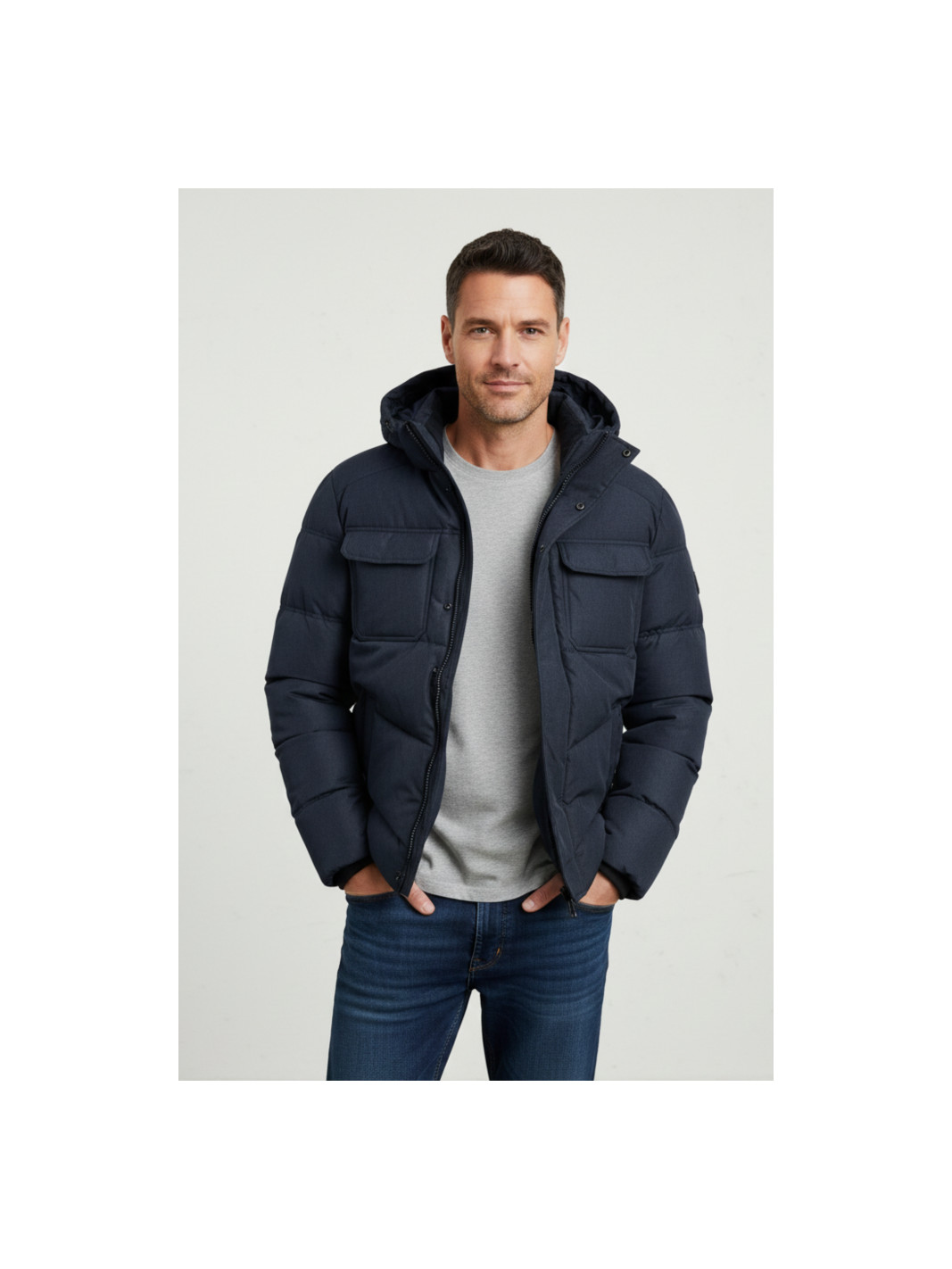 Cazadora multibolsillos en color azul marino. Con capucha desmontable. Puños de punto ajustados. Forro de poliéster reciclado para mayor confort.