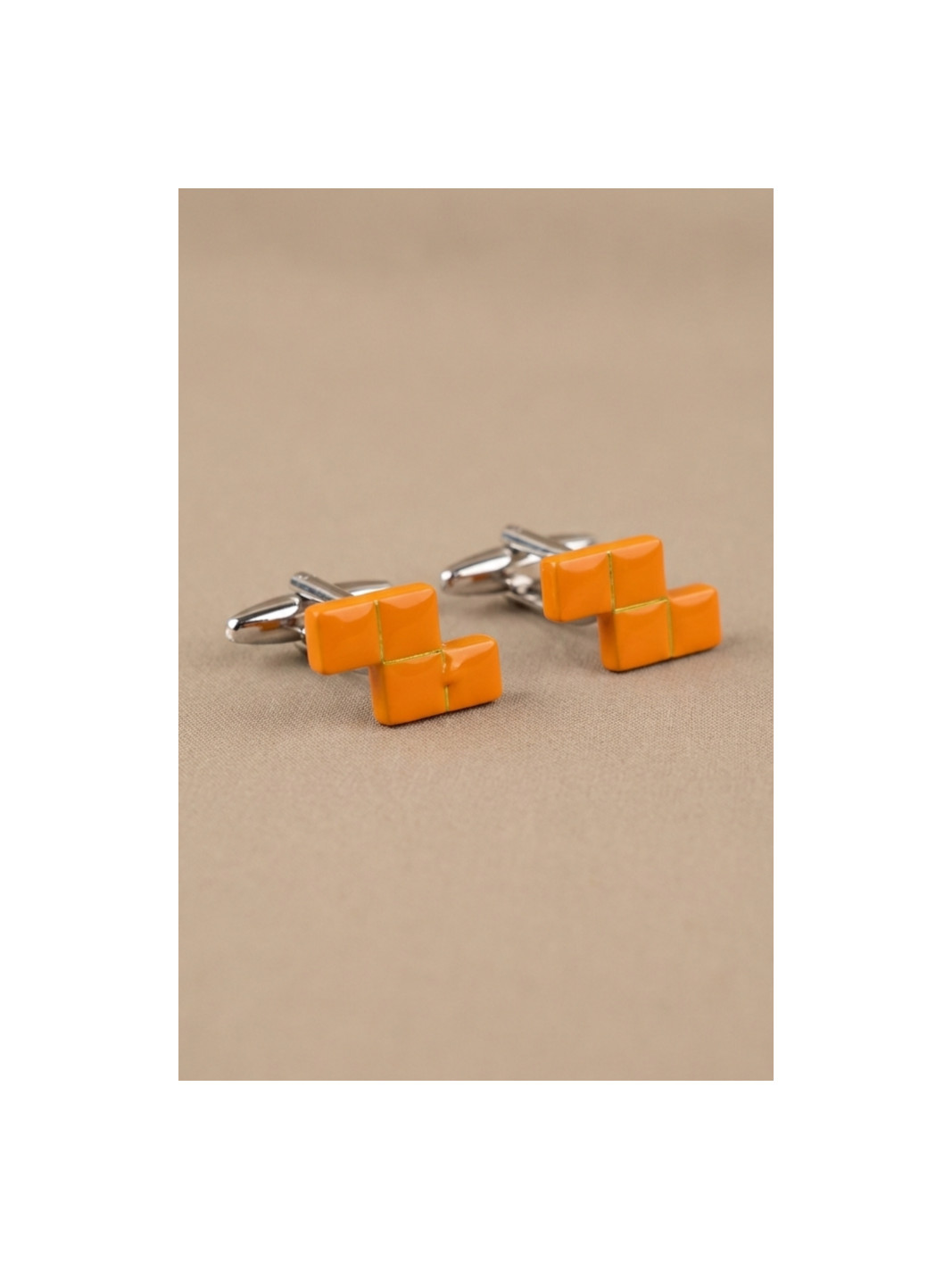 Gemelos de acero rodiado en forma de pieza de tetris en color naranja.