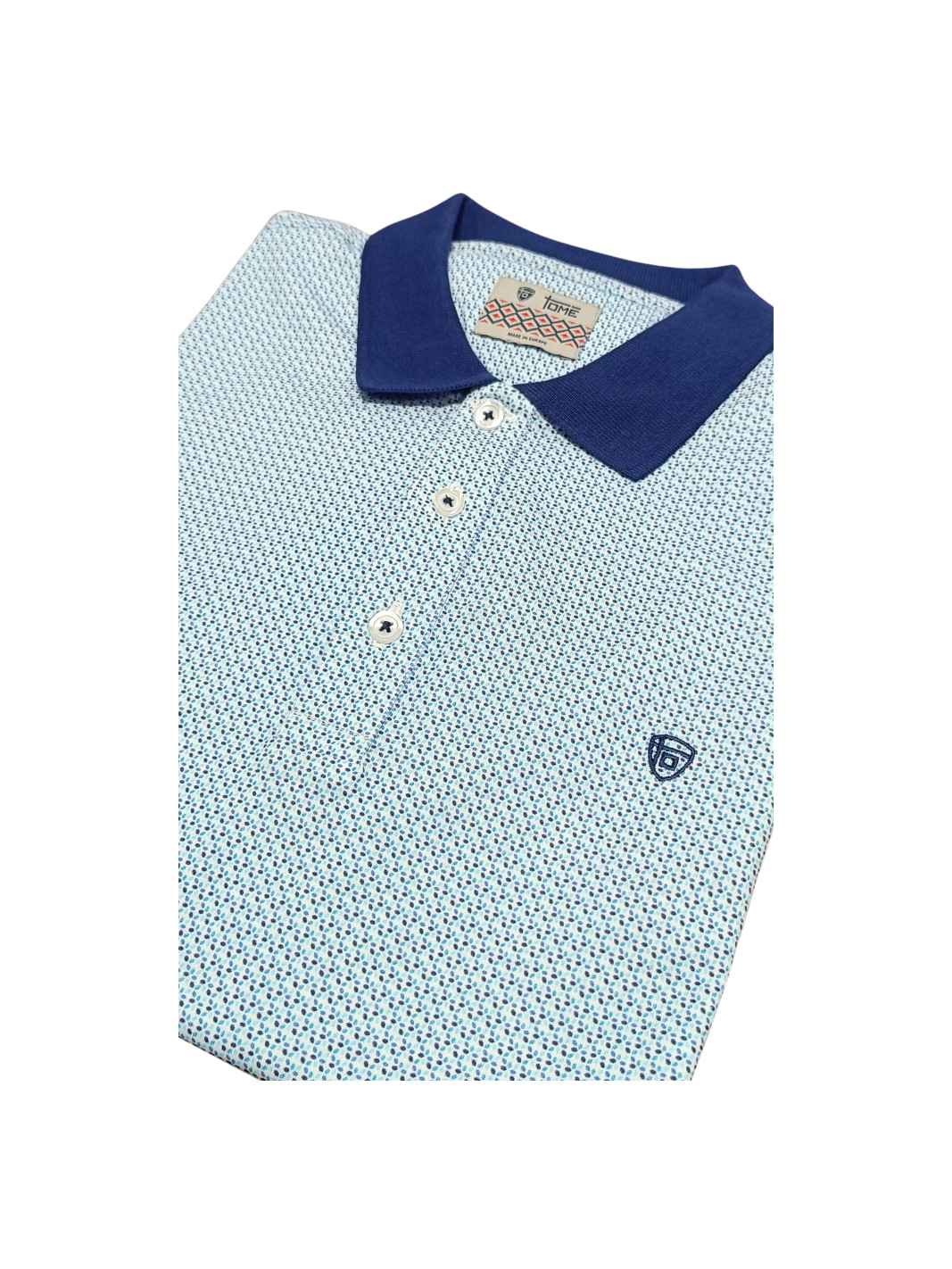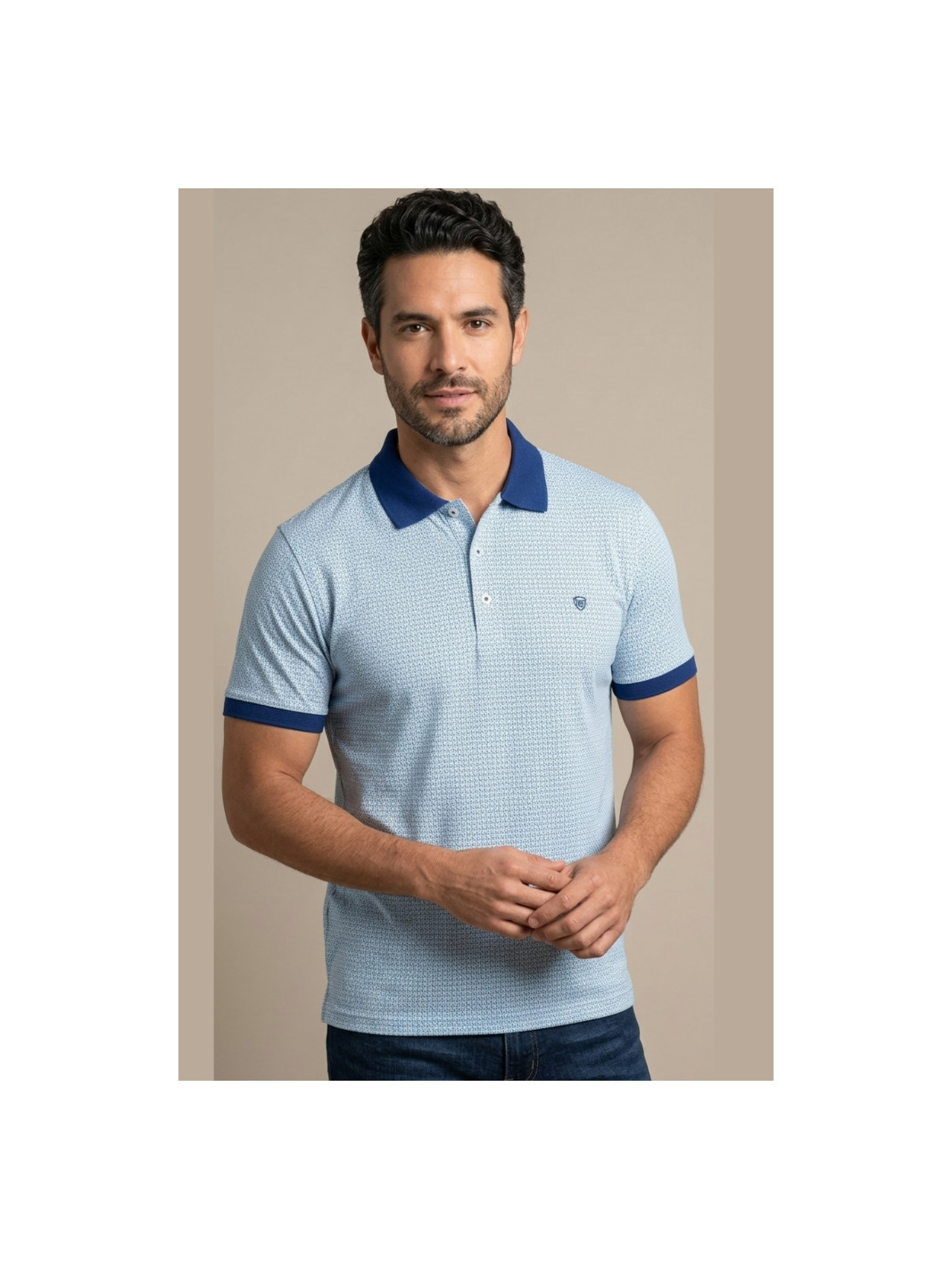 Polo manga corta con print en tonos azules. Cuello en color azul al tono de los elásticos de las mangas. Composición: 100% Algodón