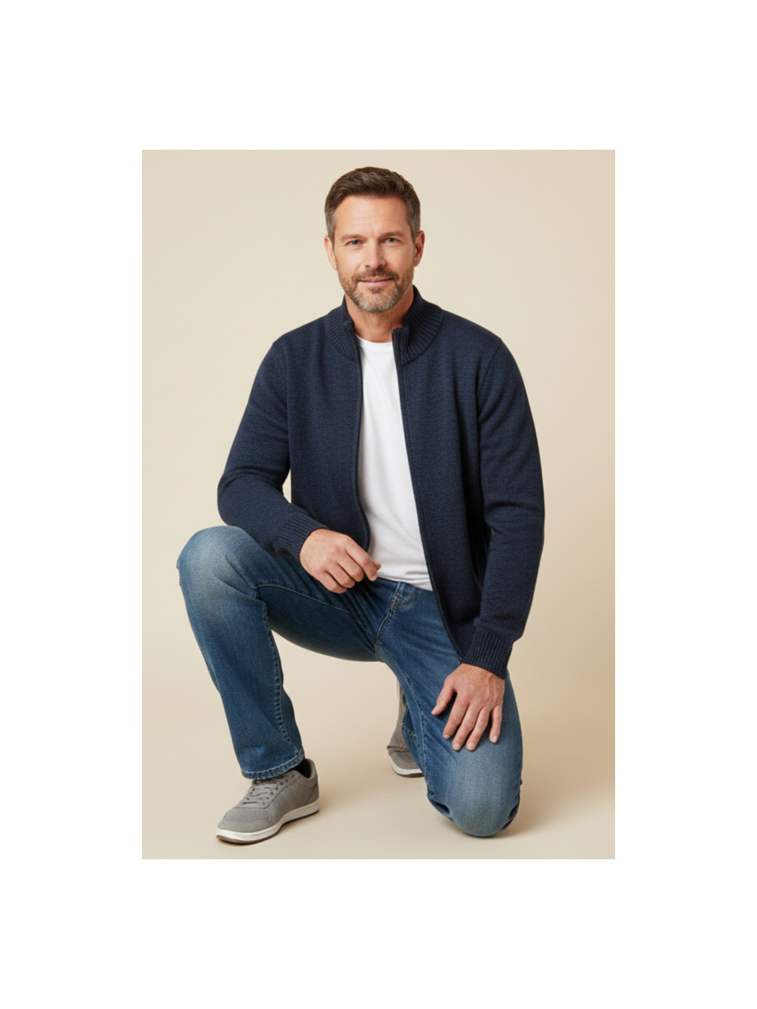 Chaqueta de punto con cierre de cremallera. En color azul tinta. Interior con forro polar. Bolsillos exteriores.