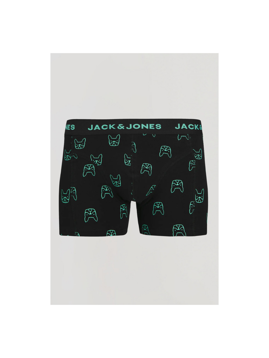 Caja de 3 boxer Jack Jones. Un boxer liso azul marino Un boxer verde con dibujo de perro Un boxer negro con dibujo de perro