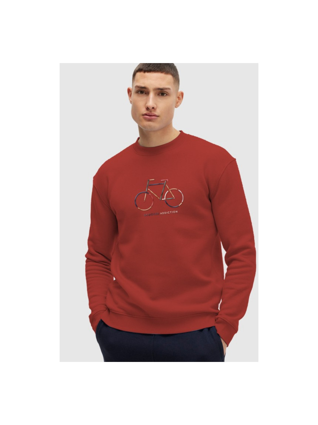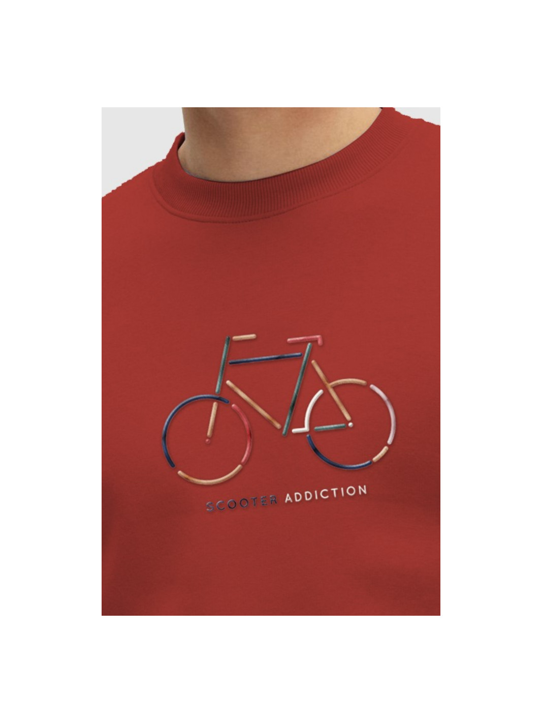Sudadera cuello redondo en color teja. Bordado de Bike multicolor. Interior afelpado
