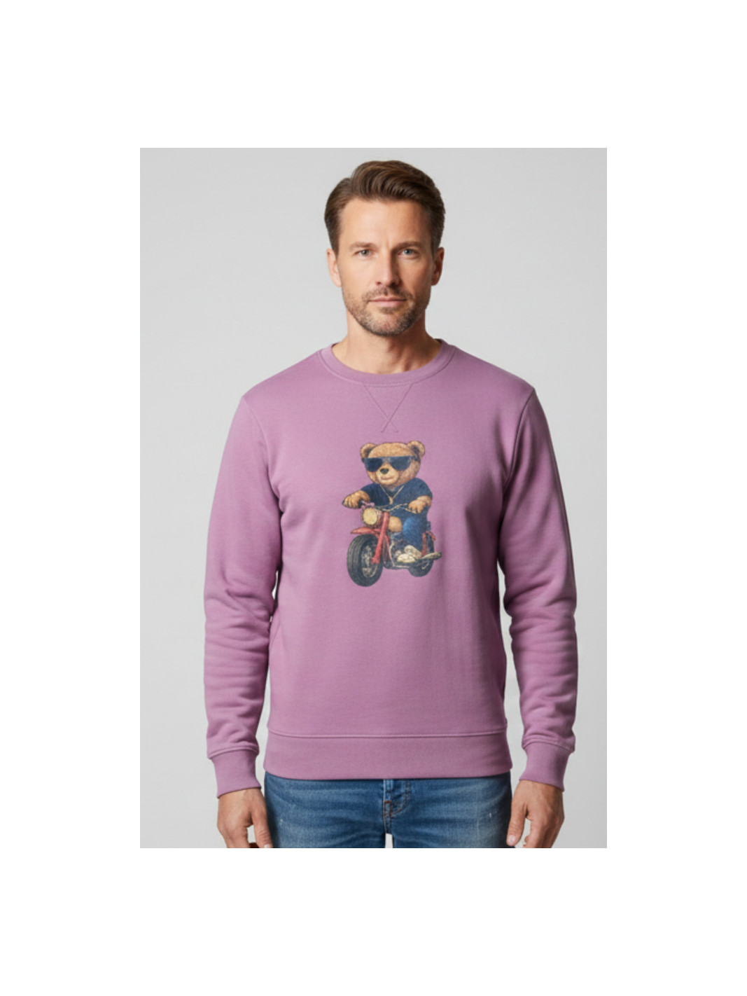 Sudadera rosa con estampado de un oso con una moto.