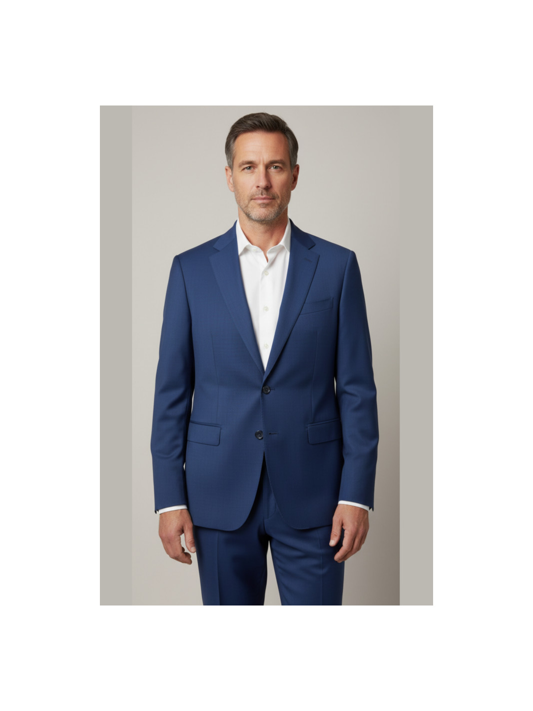 Traje azul tinta en tejido estructurado al tono. Corte Entallado. Americana con solapa y ojal, cierre de dos botones, con dos bolsillos de solapa. Pantalón con cintura elástica para un ajuste perfecto.